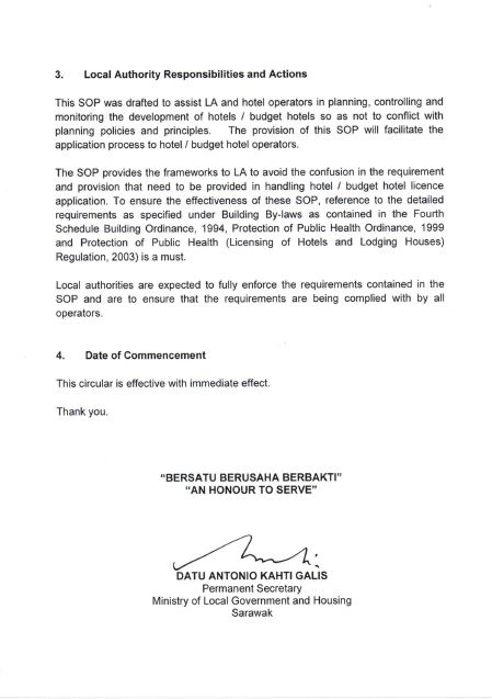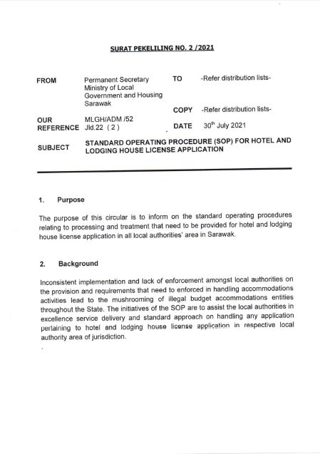 Pekeliling ini bertujuan untuk memberitahu mengenai prosedur operasi standard yang berkaitan dengan pemprosesan dan rawatan yang perlu disediakan untuk permohonan lesen hotel dan rumah penginapan di semua daerah pihak berkuasa tempatan di Sarawak.